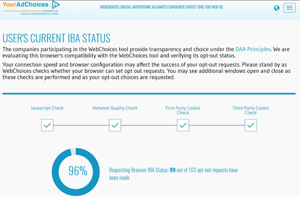 WebChoices checks your browser settings and your computer to identify: (1) whether first-party and third-party cookies are enabled; (2) which participating companies, if any, are currently customizing ads for your browser; and (3) the participating companies, if any, for which you've already set an opt out. After the status check completes, you'll see the following, with results specific for your browser:
