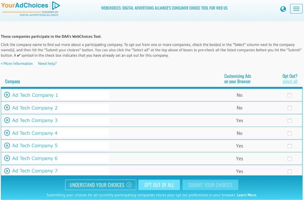 You can click on “More Information” for more information about interest-based advertising. You can also see the companies for which status information was not completed by reviewing the top of the company listing at the “Company” column. You can also see which opt-out requests were not completed on the WebChoices landing page, if any, by inspecting for unchecked boxes under the “Opt Out?” column.